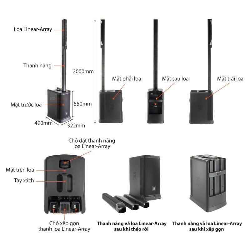 Âm thanh "JBL Professional" với chất lượng âm thanh đỉnh cao với thiết kế Treble dạng "Linear-Array" 8 x2 inch kết hợp với một loa trầm có kích thước 10 inch.